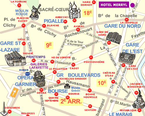 L’hotel Merryl, hôtel 2 étoiles budget, est situé à 10mn de la gare du Nord et de l’Eurostar, 15mn de la gare de l’Est, proche du musee Grevin, de Montmartre et du Moulin Rouge.